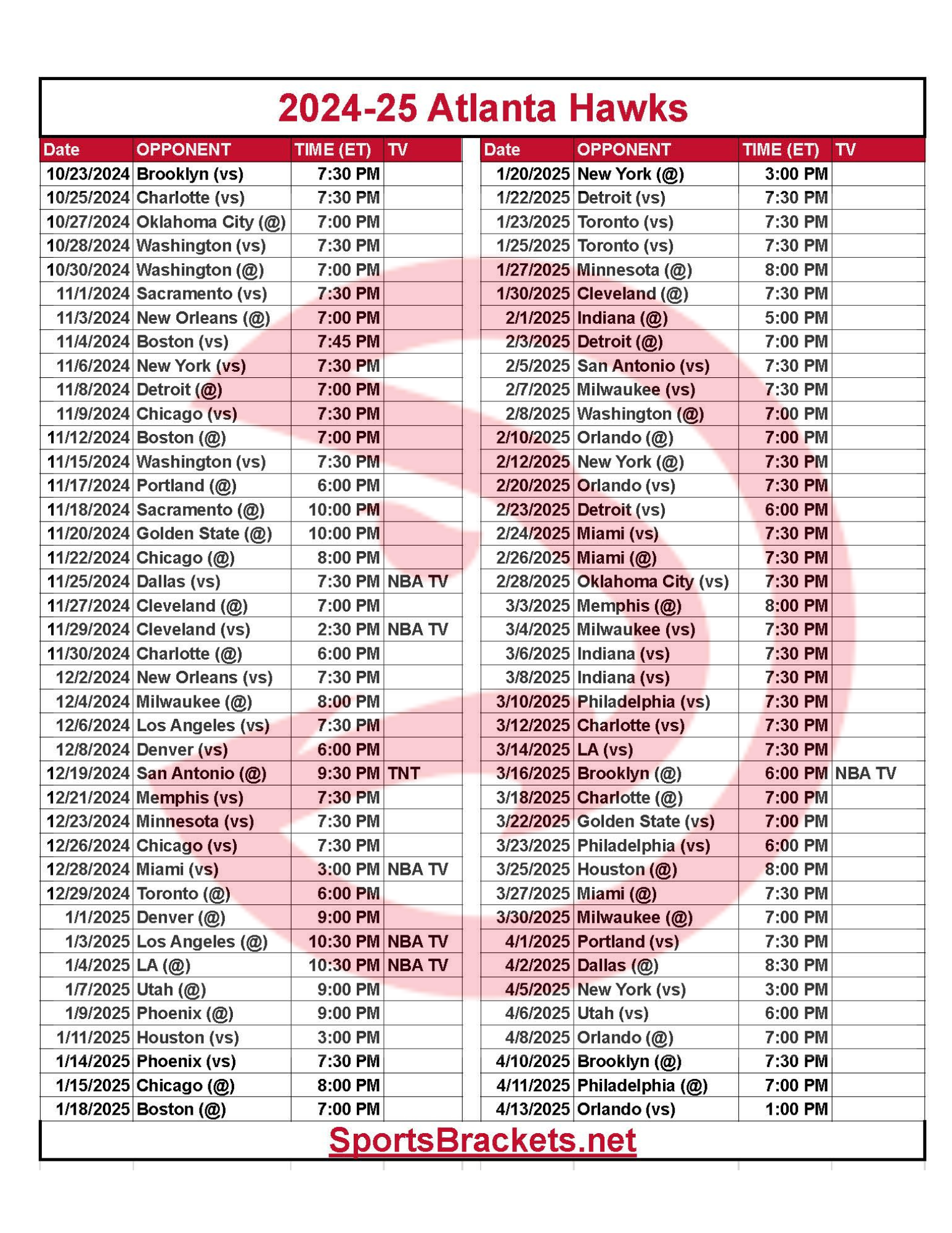 Printable 2024 25 Atlanta Hawks Schedule TV Broadcasts And Matchups Sports Brackets