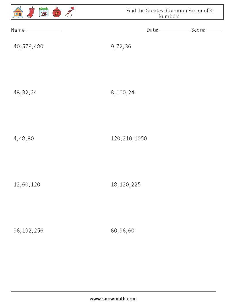 Find The Greatest Common Factor Of 3 Numbers Math Worksheets Math Practice For Kids